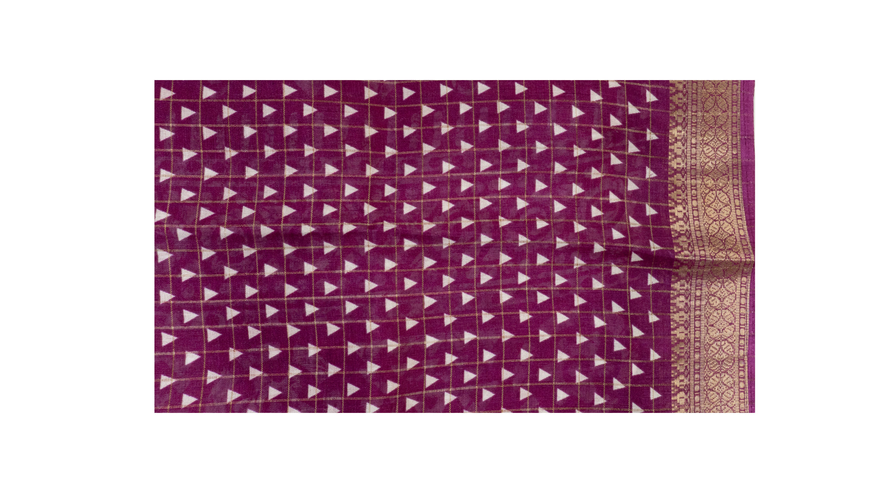 Elevate your wardrobe with this magenta saree featuring an elegant gold grid pattern. Crafted to blend traditional charm with contemporary style, its rich color and intricate design make it perfect for festive occasions and formal events. The lightweight fabric ensures comfort while draping gracefully.